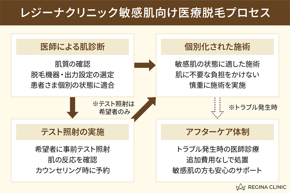 レジーナクリニックでは、敏感肌の特性に配慮した医師の診察、テスト照射、トラブル時の無料対応といった手厚い体制が整っており、脱毛による肌トラブルを最小限に抑えることができます。