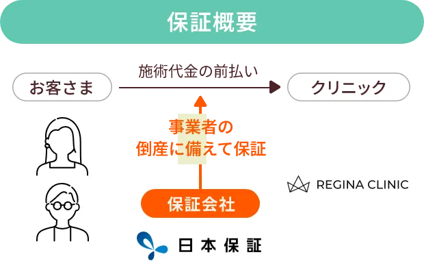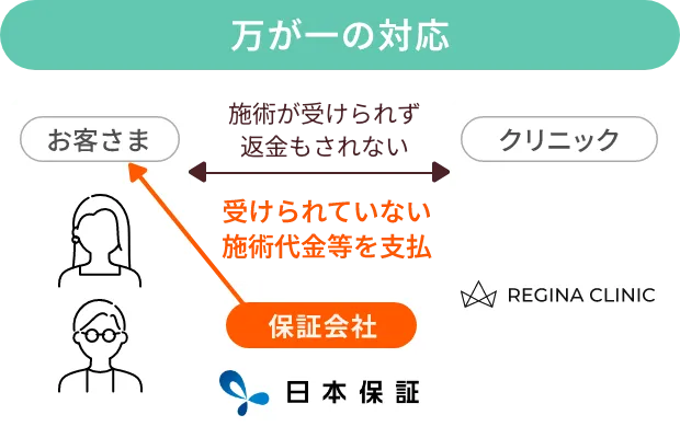 - 役務提供期間中に万が一クリニックが経営困難に陥り、施術が受けられなくなった場合、未消化分の施術代金等を株式会社日本保証が代わりに返金する保証制度です。