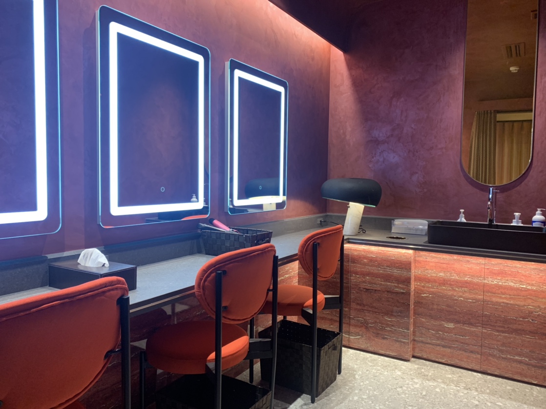 LEDライト搭載のミラーと赤いお部屋がラグジュアリーな空間を演出してくれています。